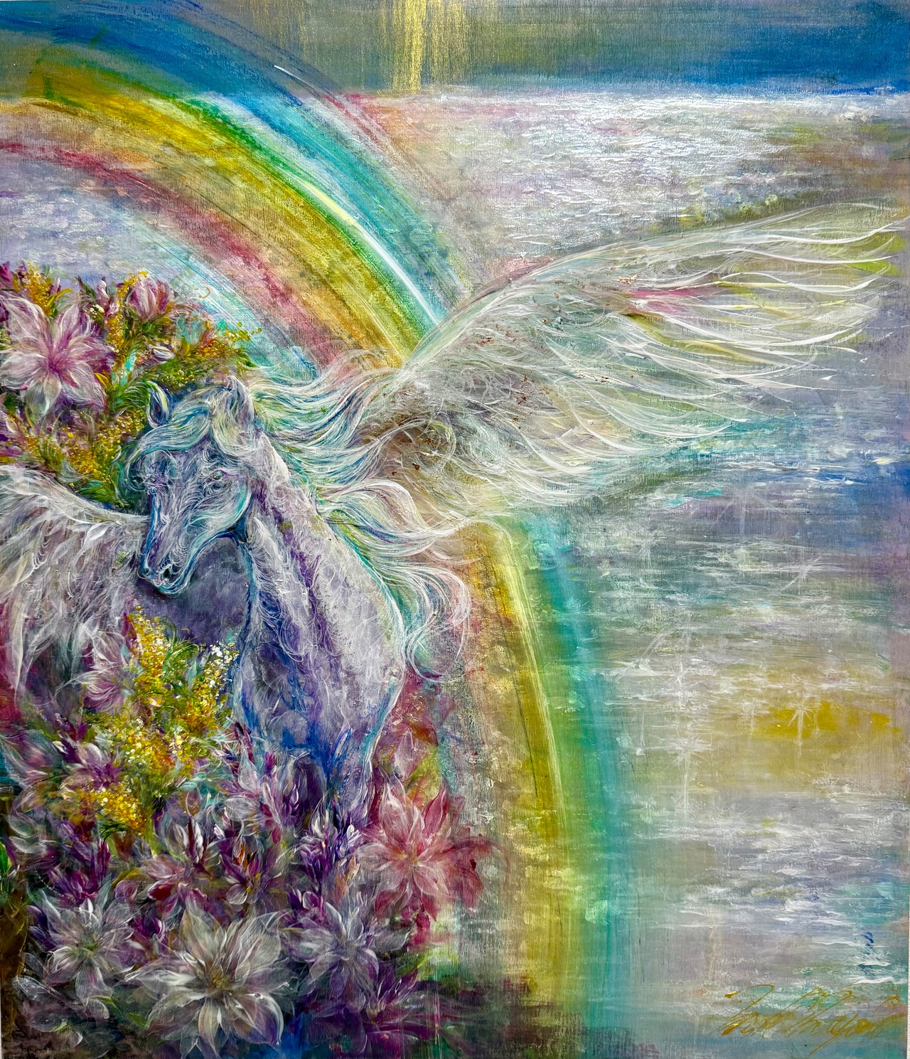 この作品を見た人が、心が軽くなり、元気を取り戻したりと、癒しとエネルギーを感じられるように祈りを込めて描き上げています。
